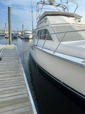 1989 Pacemaker 33 ft inboard powerboat located at Carolina Beach Yacht Club, Carolina Beach, NC. This is a solid classic Pacemaker hull with a large cockpit and flybridge, well known for being a strong, fishable platform.